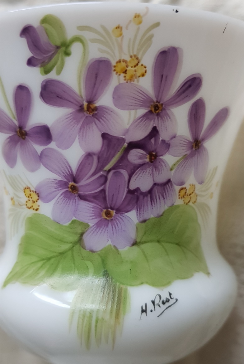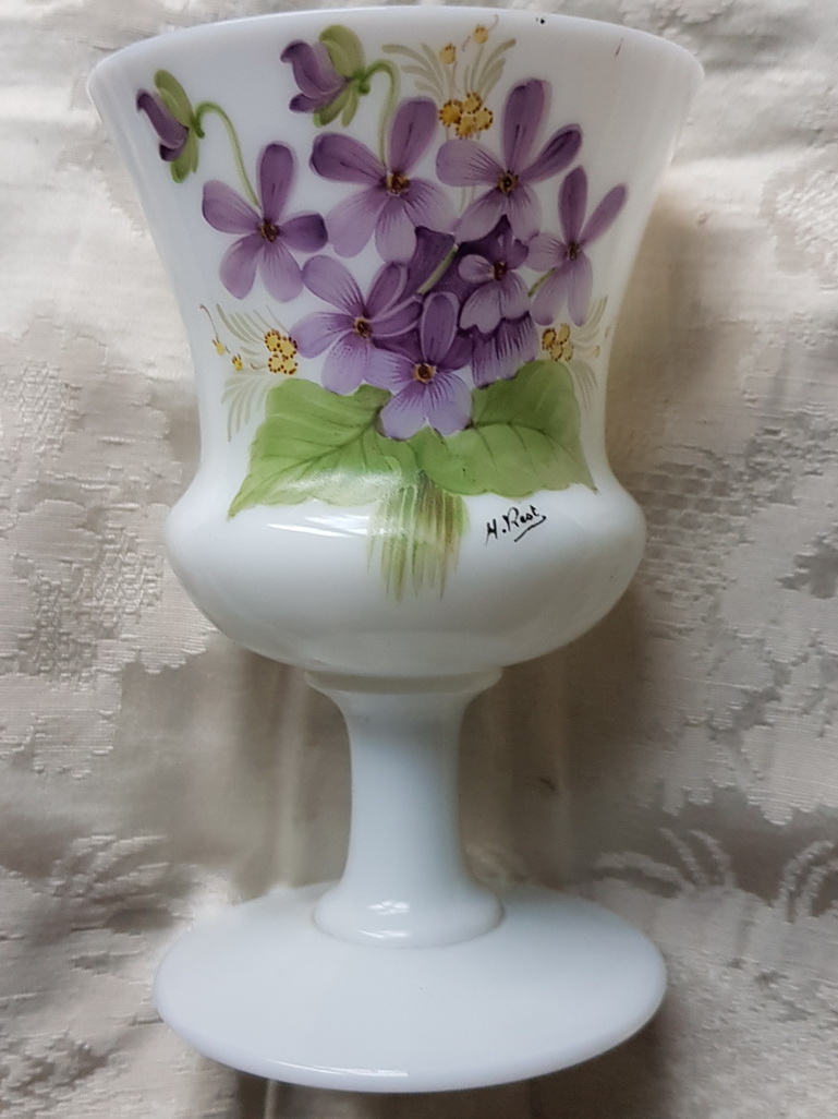 Hand painted violas small white glass vase 140 mm high 10 cm base diameter